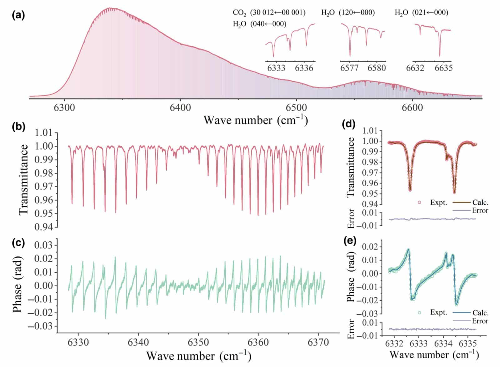 The results of the experiment are presented in Figure 2, where the measurement data is compared to theoretical calculations. The residual error of the measured amplitude spectrum is considerably less than 0.01 for the strong overlapping features of CO2 and H2O. At the same time, the average residual of the phase spectrum is 0.2 mrad, corresponding to a refraction-index variation of about 6×10−14 over the target path. This result is comparable to measurements using a coherently phase-locked comb scheme.