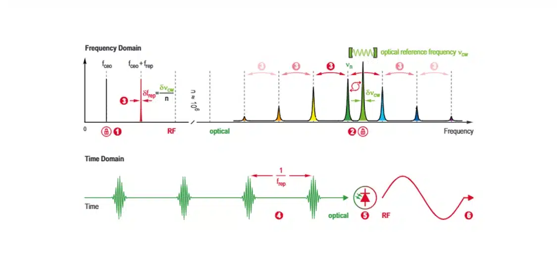 At the heart of the experiment are three Menlo Systems Ultrastable Microwave Systems (UMS-Mini) which use a technique known as optical frequency division (OFD), in which an optical frequency comb divides the frequency of an optical reference to generate microwave signals. The frequency comb (an ultrashort-pulsed mode-locked laser) provides a train of evenly spaced lines in the frequency domain. While each of these lines is in the optical realm, the spacing between these lines (or repetition rate) lies in the RF domain. When the frequency comb is locked in its two degrees of freedom, the carrier-envelope offset and one of the comb teeth, and the RF signal of the repetition rate is extracted, this signal now inherits only a fraction (specifically, the inverse number of lines in the comb spectrum) of the instability of the entire comb spectrum. Through this approach, these systems achieve phase noise levels as low as -80 dBc/Hz at 1 Hz offset from a carrier on the order of multiple GHz and a fractional frequency instability of less than 5 × 10⁻¹⁵, making them ideal reference oscillators for cross-spectrum measurements.