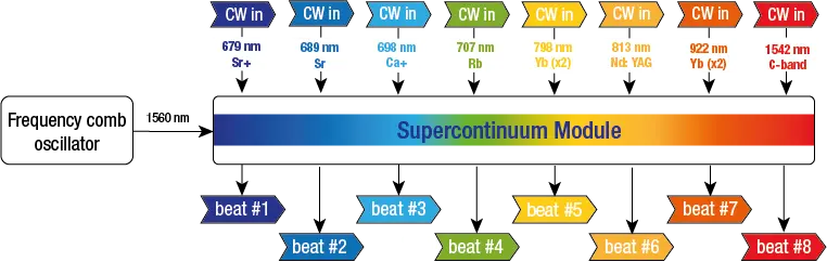 Since the supercontinuum spectrum is produced from one single amplifier branch, it is the perfect tool for frequency comparisons of different optical clock species and other high-end applications. Additionally, it offers high-flexibility: you could start e.g., with 3 “beat detection channels” and extend the module at a later time. A Menlo service engineer can easily add new channels and/or adapt the already existing ones, directly on-site.