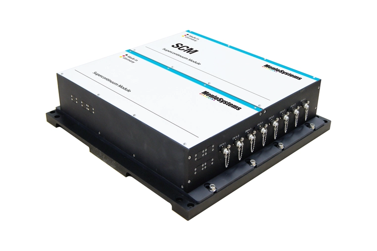 The Supercontinuum Module (SCM) is a frequency comb extension (available for FC1500-ULN-nova/plus and FC1500-Quantum) which delivers up to 8 beat signals between ultra-low-noise frequency comb light and different CW lasers in the range of 670 to 1700 nm. It provides up to 8 CW laser input ports (FC/APC, others on request) and delivers the according beat signals (between the CW laser light and its closest neighboring comb mode) at up to 8 BNC output ports. The super-broad and smooth comb spectrum, combined with our latest generation of optical beat detection units, leads to high signal-to-noise ratio beat signals over the entire wavelength range (> 35 dB SNR).
